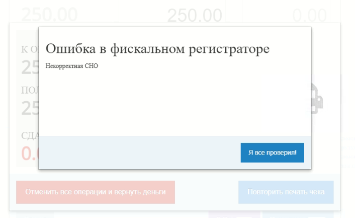 Ошибка: Ошибка в фискальном регистраторе. Закрытие чека прервано